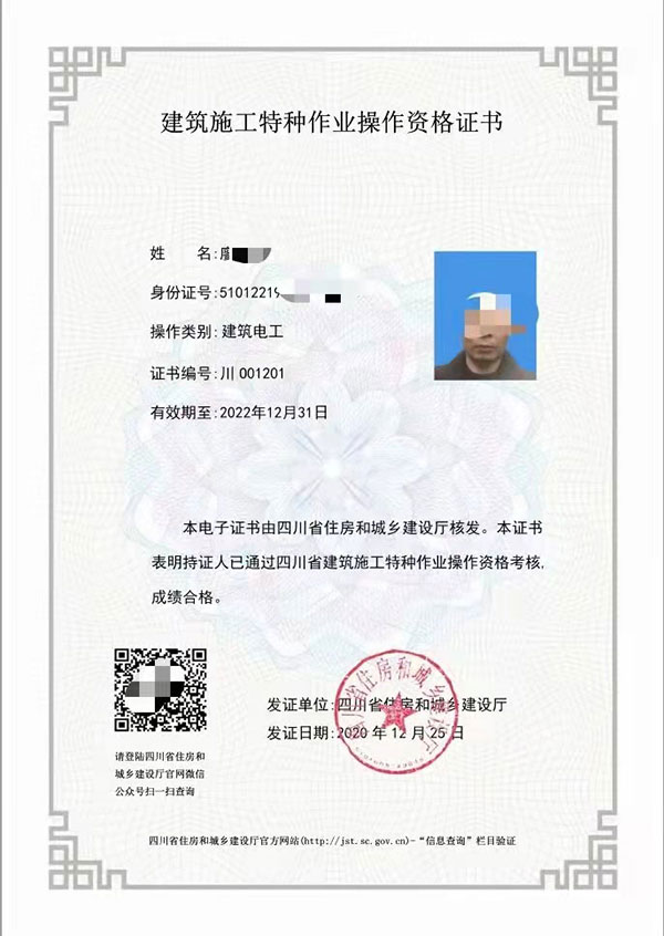 建筑電工特種作業操作資格證書建設廳頒發的