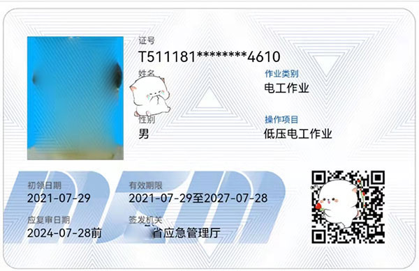 特種作業(yè)操作證: 作業(yè)種類:電工(俗稱 操作證 、 上崗證 ),分類:高壓運行維護作業(yè)、高壓安裝修造作業(yè)、低壓電工作業(yè)、安裝、維修、發(fā)電、配電。自2010年后,老版特種作業(yè)操作證( IC卡 )樣本改用二代身份證似的 IC卡 類新版中華人民共和國特種作業(yè)操作證樣本,復(fù)審為三年一審,可以用到60歲退休為止。